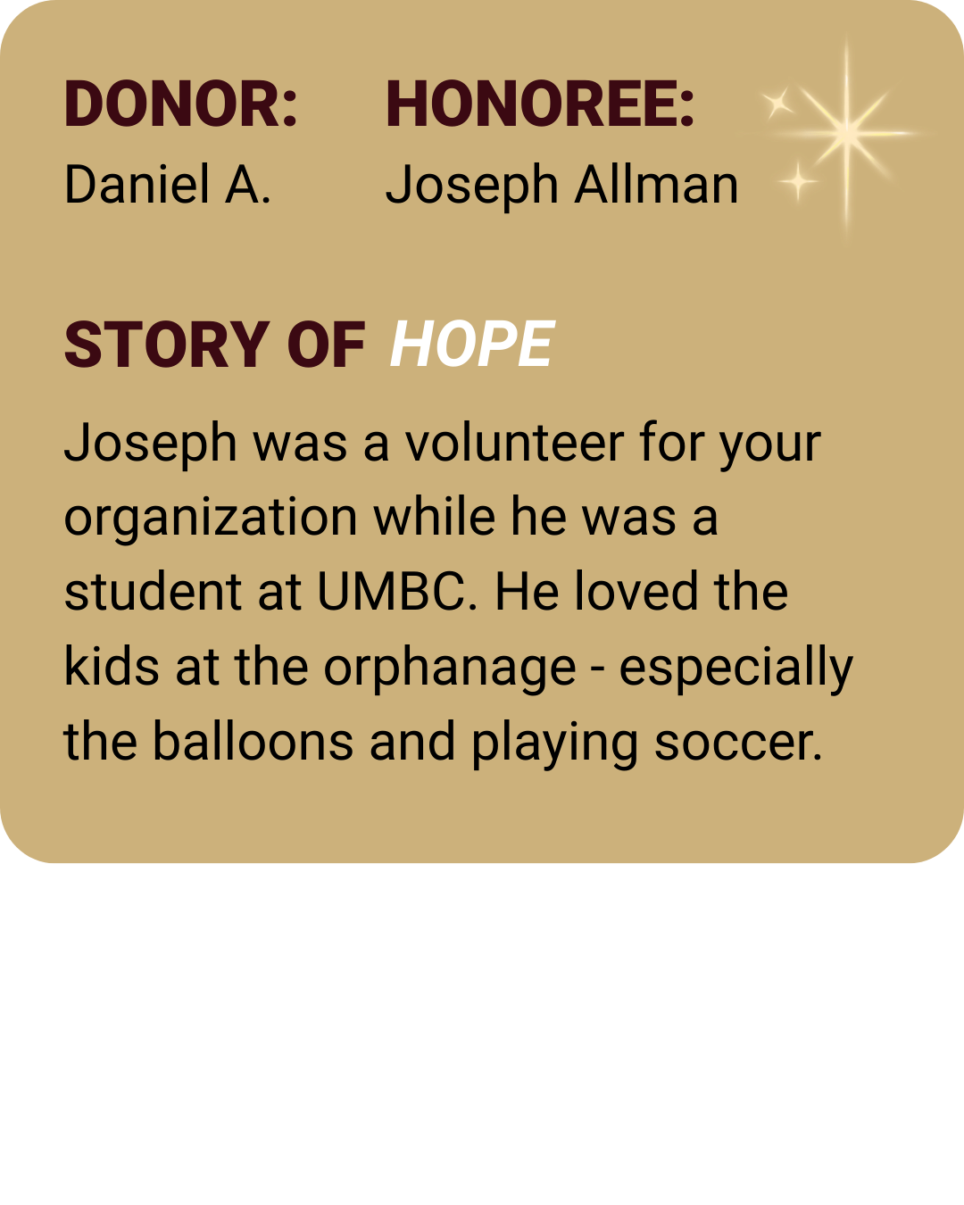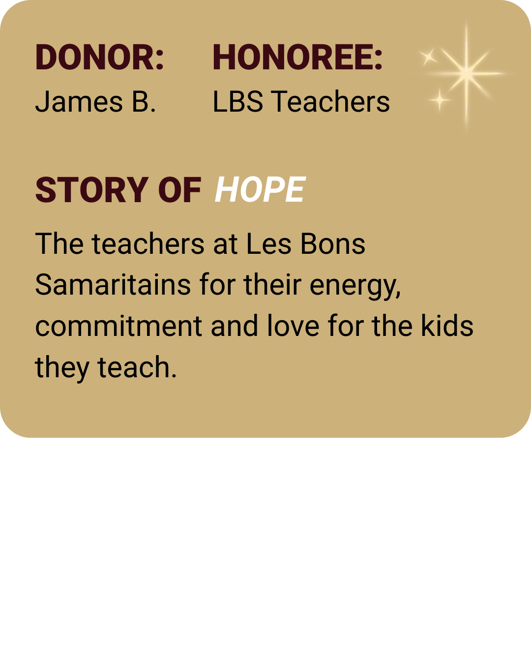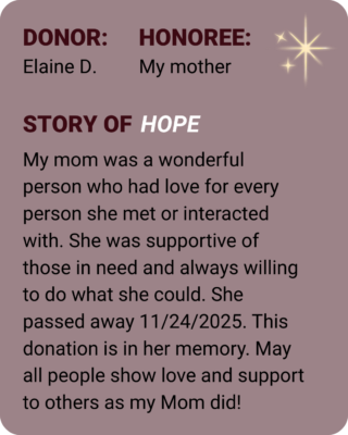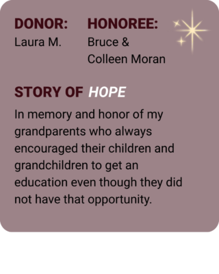 Each dedication on this wall honors someone who sparked hope in your life and fuels hope for a child who needs it most, with the gift of education, daily meals, and a safe place to grow.